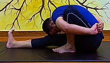 Marichyasana III left-right symmetric the leg on the ground is stretched out straight. The body is twisted towards the side with the bent leg, and again the arms are clasped behind the back and around the raised knee https://en.wikipedia.org/wiki/Marichyasana