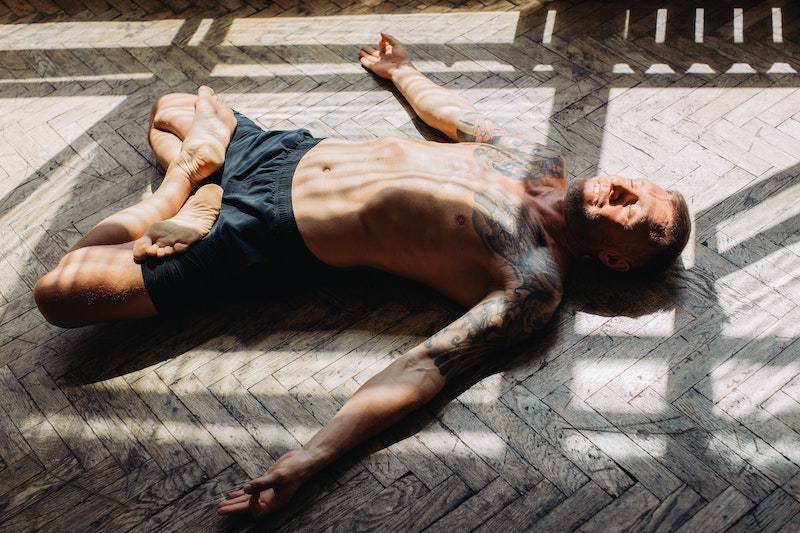 back is on ground, legs in lotus